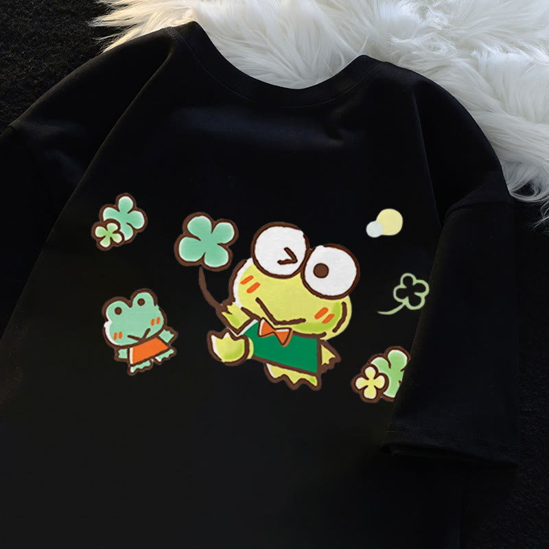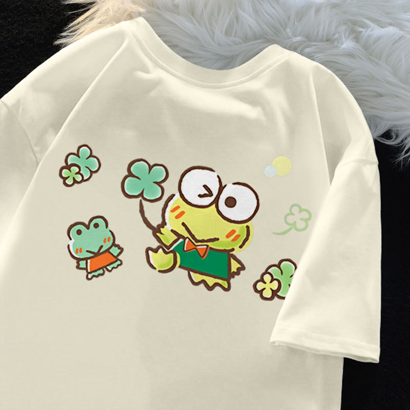Modakawa Frog Four-leaf Clover Print Casual T-Shirt