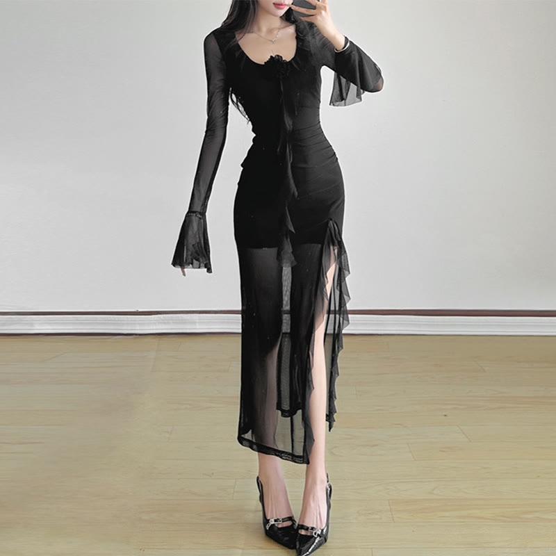 Flower Mesh See-through Slit Dress