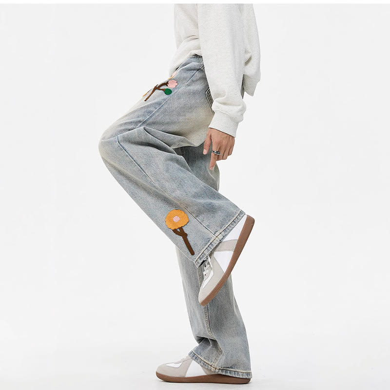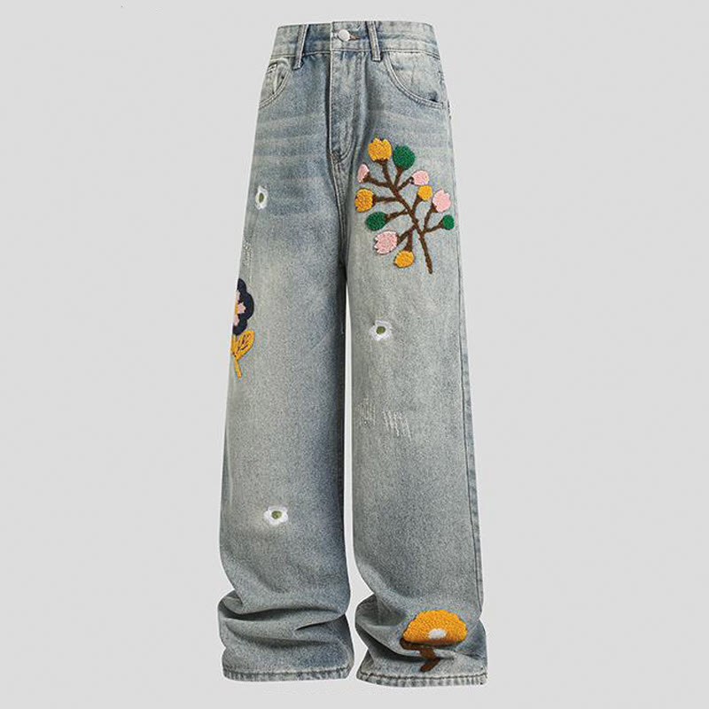 Flower Leaf Flocking Print Denim Pants