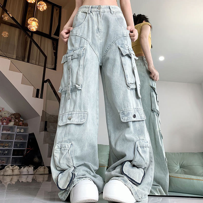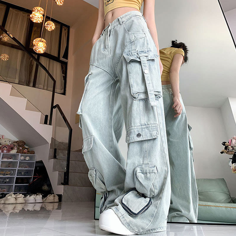 Pure Color Pocket Denim Cargo Pants