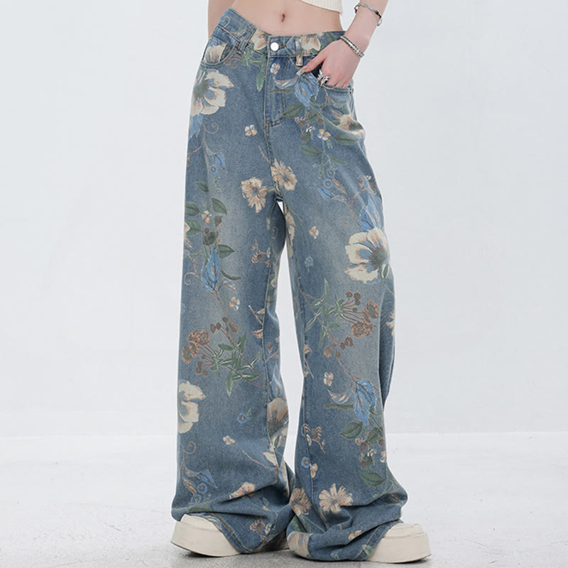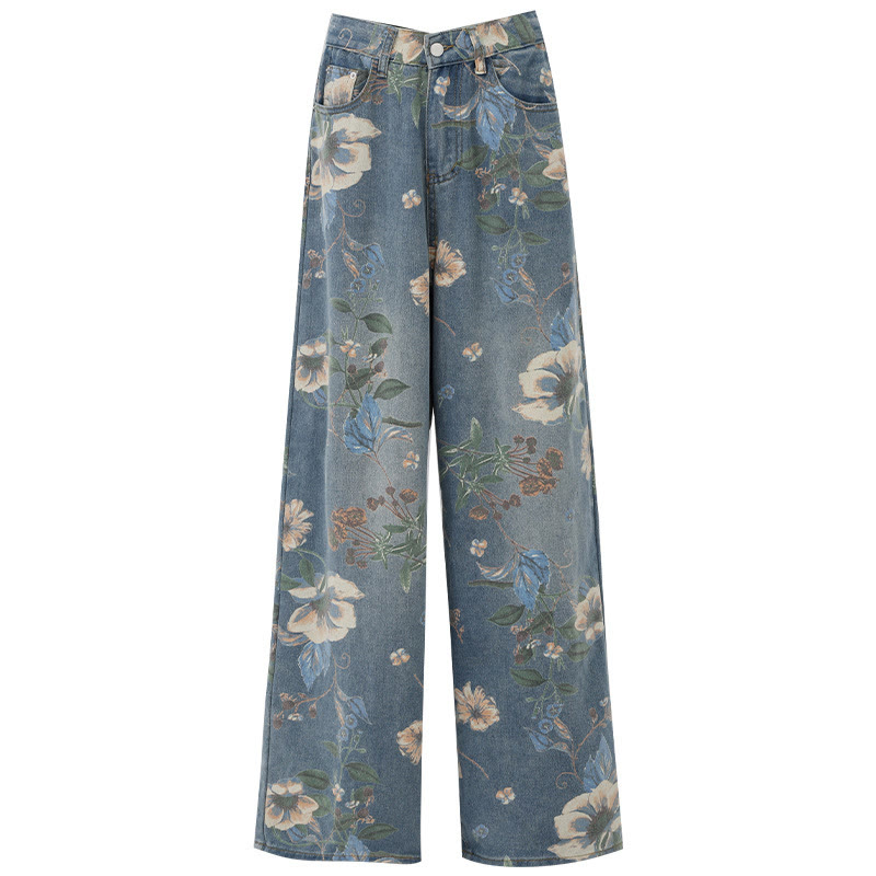 Flower Print Casual Denim Pants